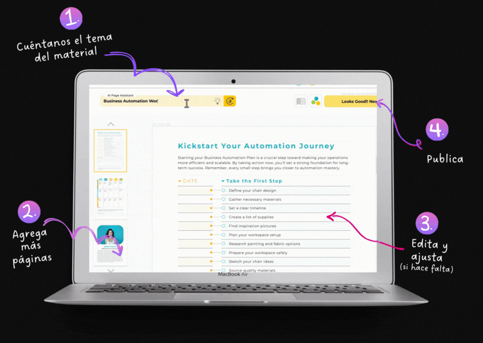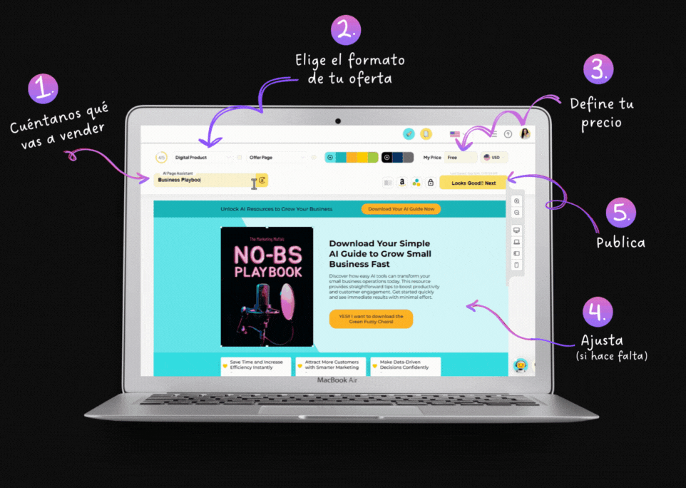 No. Solo escribe una frase con la idea de tu producto y la IA hace el resto.